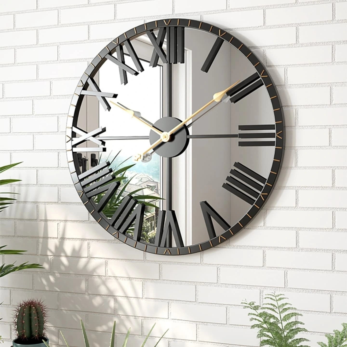 "Crafted on a solid base with a lifetime-lasting black acrylic mirror, bordered by durable acrylic glass, featuring golden acrylic numbers and center dial''
